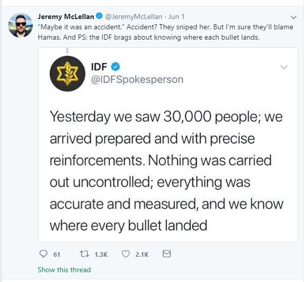 : : “Maybe it was an accident.” Accident? They sniped her. But I’m sure they’ll blame Hamas. And PS: the IDF brags about knowing where each bullet lands.