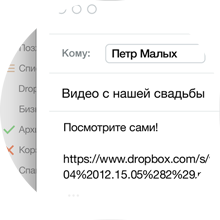 Поделиться большим файлом так же просто, как и маленьким. Поместите нужный файл в Dropbox, а потом быстро отправьте его с помощью ссылки доступа.