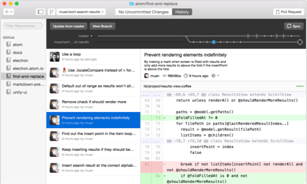 GitHub Desktop for Windows and Mac makes sharing code simple. You can use it to clone repositories, create branches, browse history, and commit changes with a friendly interface. Our mobile web views let you keep track of your projects on the go.