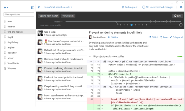 With GitHub you can easily and efficiently compare any two branches in your project or network. See what work is unique to a branch with respect to another branch—that is, if you were to merge the branches together, what changes would be applied?