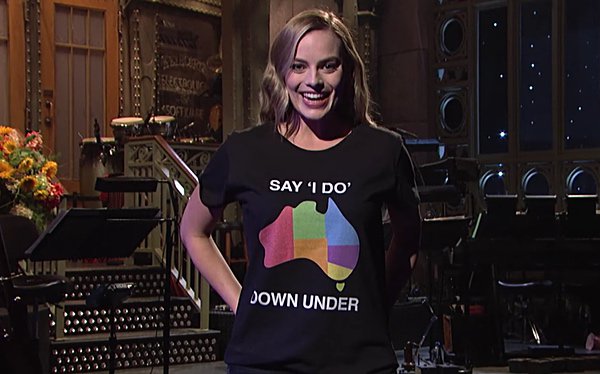 @MargotRobbie Wears Support for Australian Marriage Equality on SNL: WATCH http://tlrd.us/2dkWH7m#sayIDopic.twitter.com/5NdWkhno8t