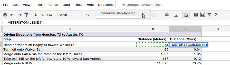 5. Select the menu item Directions > Generate step-by-step. (The Directions menu is a custom menu that the script added to the spreadsheet. It should have appeared a few seconds after you reloaded the spreadsheet.)