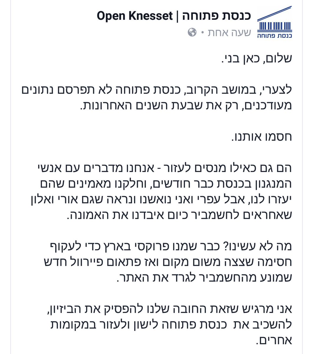 טרי: כנסת פתוחה נחסמה. לדברי מייסדה בני דאון, חברת המיחשוב הפרטית שיש לה חוזה עם הכנסת, רואה ב'כנסת פתוחה' תחרות ולכן חוסמת אותה.pic.twitter.com/1Ai2nbeKYp