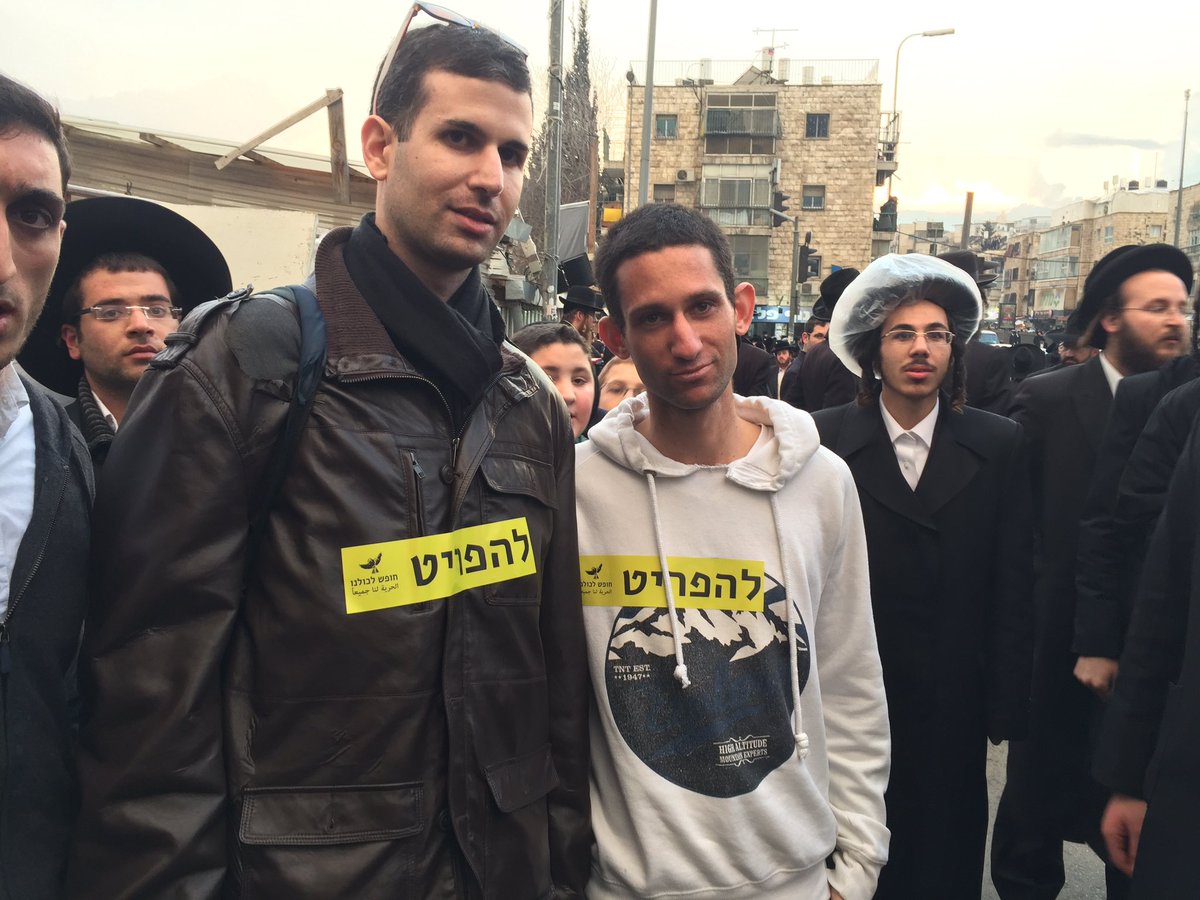 האטרקציה בהפגנת החרדים בירושלים: 2 תומכים חילונים מתנועת ״חופש לכולנו״ נגד גיוס חובה לצבא