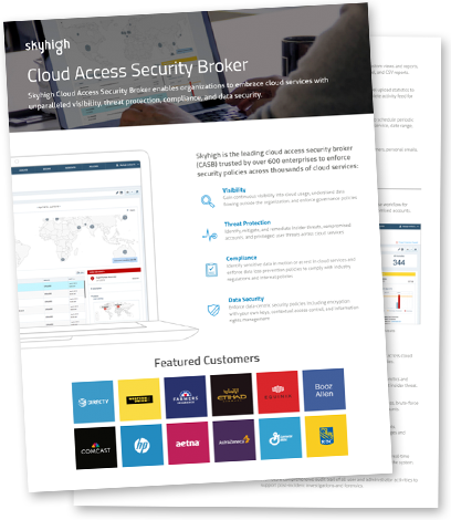 Skyhigh is a cloud access security broker (CASB) that helps organizations address both sides of the cloud data security challenge – shadow IT and sanctioned IT. Using Skyhigh, organizations get detailed cloud analytics to discover all cloud services in use including SaaS, PaaS, and IaaS. Skyhigh summarizes cloud usage, revealing which cloud services are in greatest demand by employees so IT can invest in those categories to support innovation and growth in the business. The solution provides an objective risk assessment for all cloud services, identifies anomalies indicative of data exfiltration, and quantifies overall risk to benchmark with peers.
