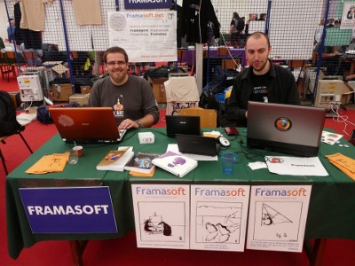 L’espace vente des différents produits Framasoft qui peuvent se matérialiser : Framakey, Framabook, Framadvd mais aussi des goodies et des tee-shirts.