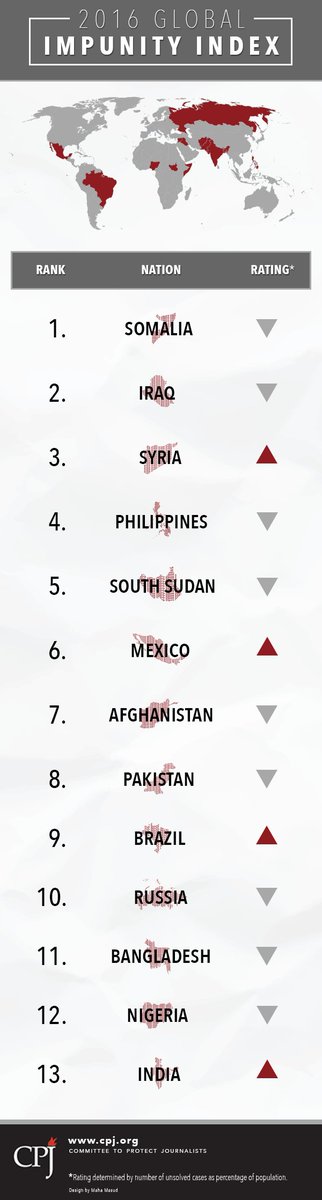 "CPJ's 2016 impunity index spotlights countries where journalists are slain and the killers go free."