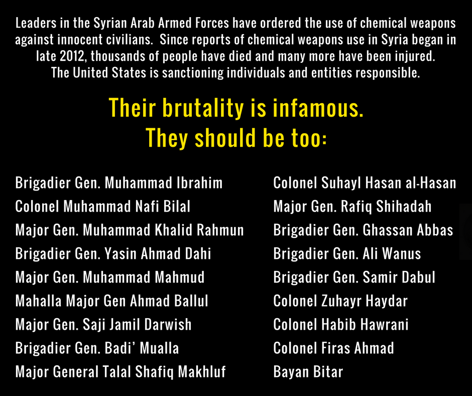 #Syria chemical weapons attacks must be held accountable. Today we sanctioned them: http://go.usa.gov/x9Pju pic.twitter.com/Hqc5JlAMD8