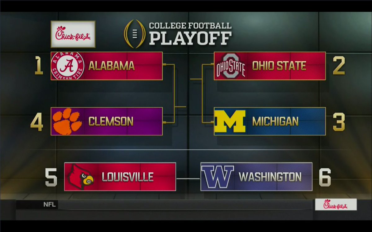Updated CFP rankings! 1. Alabama 2. Ohio State 3. Michigan 4. Clemsonhttp://www.sbnation.com/college-football/2016/11/15/13638880/college-football-playoff-rankings-2016-top-25-updated-new-full?utm_campaign=sbnation.social&utm_medium=social&utm_content=sbnation&utm_source=twitter …