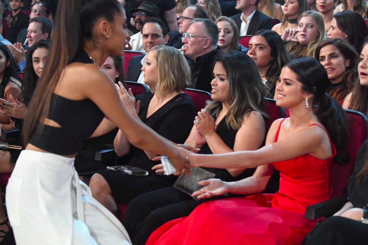 : Artist of the Year @ArianaGrande greets Favorite Female Artist@SelenaGomez http://thr.cm/zeL0Fn pic.twitter.com/zWnMUoJomH