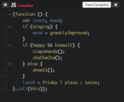 To see that yourself (a great way to learn what CoffeeScript does), click the "View Compiled" button and the editor will show you the compiled preview of what you have written. Note that you can't edit the compiled view, though.