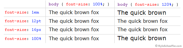 Let’s see what happens with font-size of child elements if you increase the base font size (body font-size) from 100% to 120%: