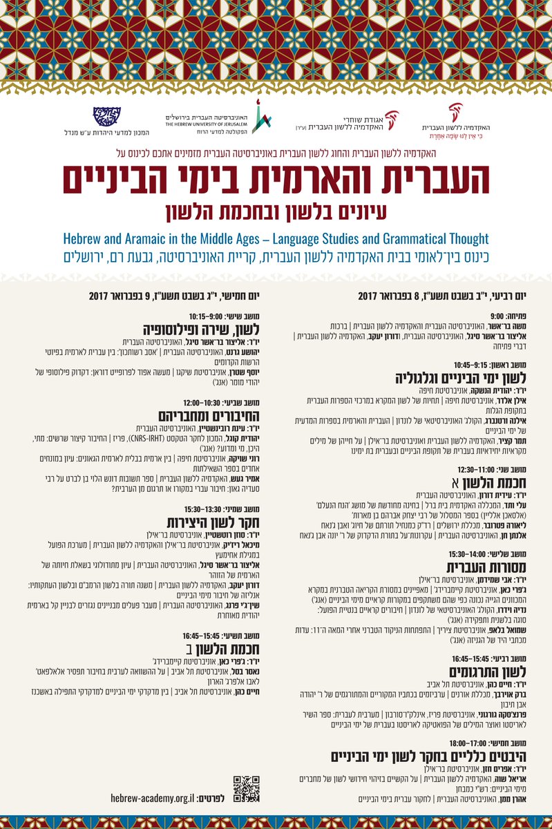 כינוס בין־לאומי: העברית והארמית בימי הביניים – עיונים בלשון ובחכמת הלשון י"ב–י"ג בשבט, 8–9 בפברואר בית האקדמיה ללשון העברית (פרטים באתר)pic.twitter.com/3cEZIv6DiQ