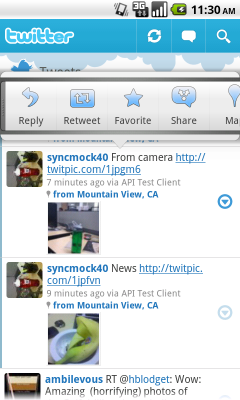 One of the most important intents we added to Twitter for Android was the ability to sync your Twitter contacts into the phone. This integration also allowed us to give Twitter users with an Android phone the use of the QuickContact widget, which gives users a choice of ways to contact their followers.