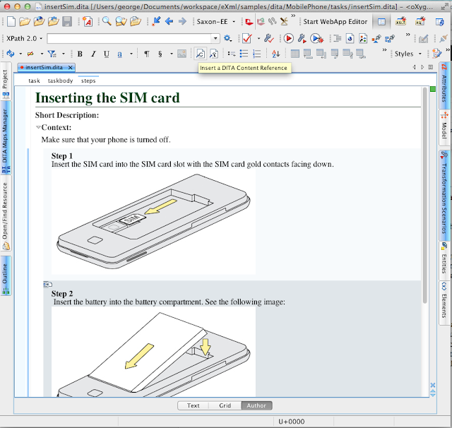 Here it is an example of adding a content reference to a topic. Let's say we have this topic talking about inserting the SIM card in a phone. For that we need to remove the battery, insert the SIM and then add the battery. If we already have a task for removing the battery then we can reuse those steps instead of duplicating them. At the beginning of the steps element we need to add a content reference to refer to the steps from the task that describes how to remove the battery.