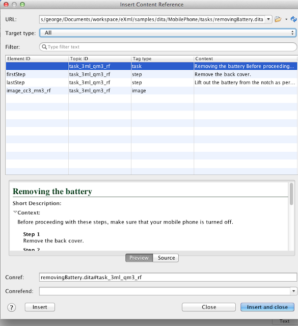 Now, you can filter on the type of element that you want to refer using the Target Type combobox and you can also filter on content, topic ID and element ID using the Filter input. As the content is dynamically gathered from each element, it is a better practice to use this search functionality than to put part of the content in the ID value. If the content changes in time that ID value will be very difficult to maintain to keep it up-to-date with the changes made to content - either you leave an old ID value that does not match the updated content, or you change the ID value and then you need to change all the references to that ID.