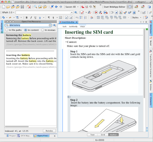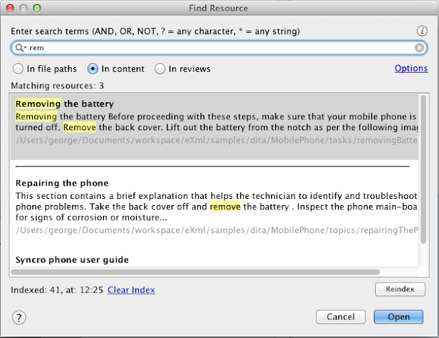 The search functionality is available also directly in oXygen, both as a dialog and as a side view, for example if you use Window->Show View->Open/Find Resource then you will see the Open/Find Resource view that will help you search through all your resources, in content, in file paths and in reviews. The content search also supports XML elements, for example "title:battery" will find all topics that have the word battery in their title.