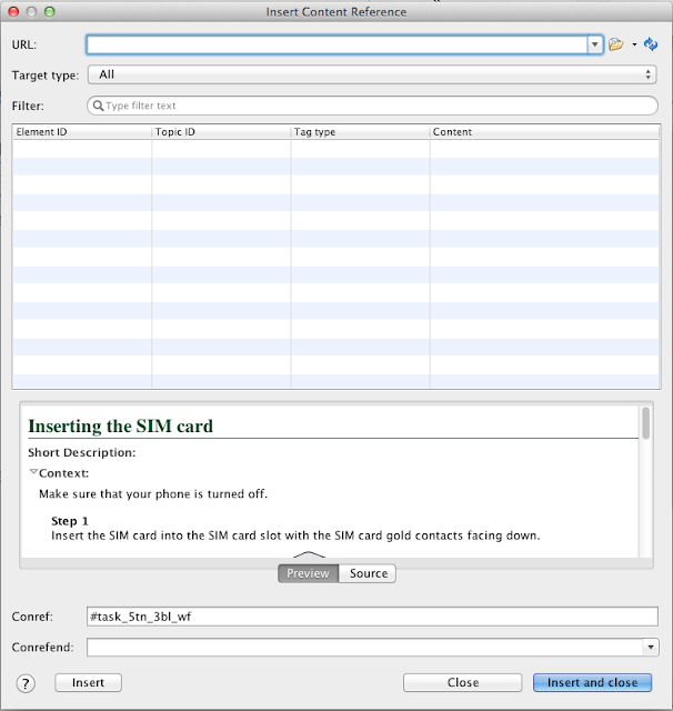Now, you can filter on the type of element that you want to refer using the Target Type combobox and you can also filter on content, topic ID and element ID using the Filter input. As the content is dynamically gathered from each element, it is a better practice to use this search functionality than to put part of the content in the ID value. If the content changes in time that ID value will be very difficult to maintain to keep it up-to-date with the changes made to content - either you leave an old ID value that does not match the updated content, or you change the ID value and then you need to change all the references to that ID.