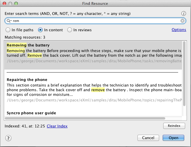 Now oXygen will show the Find Resource dialog where you can search for content to identify the task that describes how to remove the battery. For example, once you start typing in the search field "rem", oXygen will show you the topics that match this prefix, sorted by relevance.