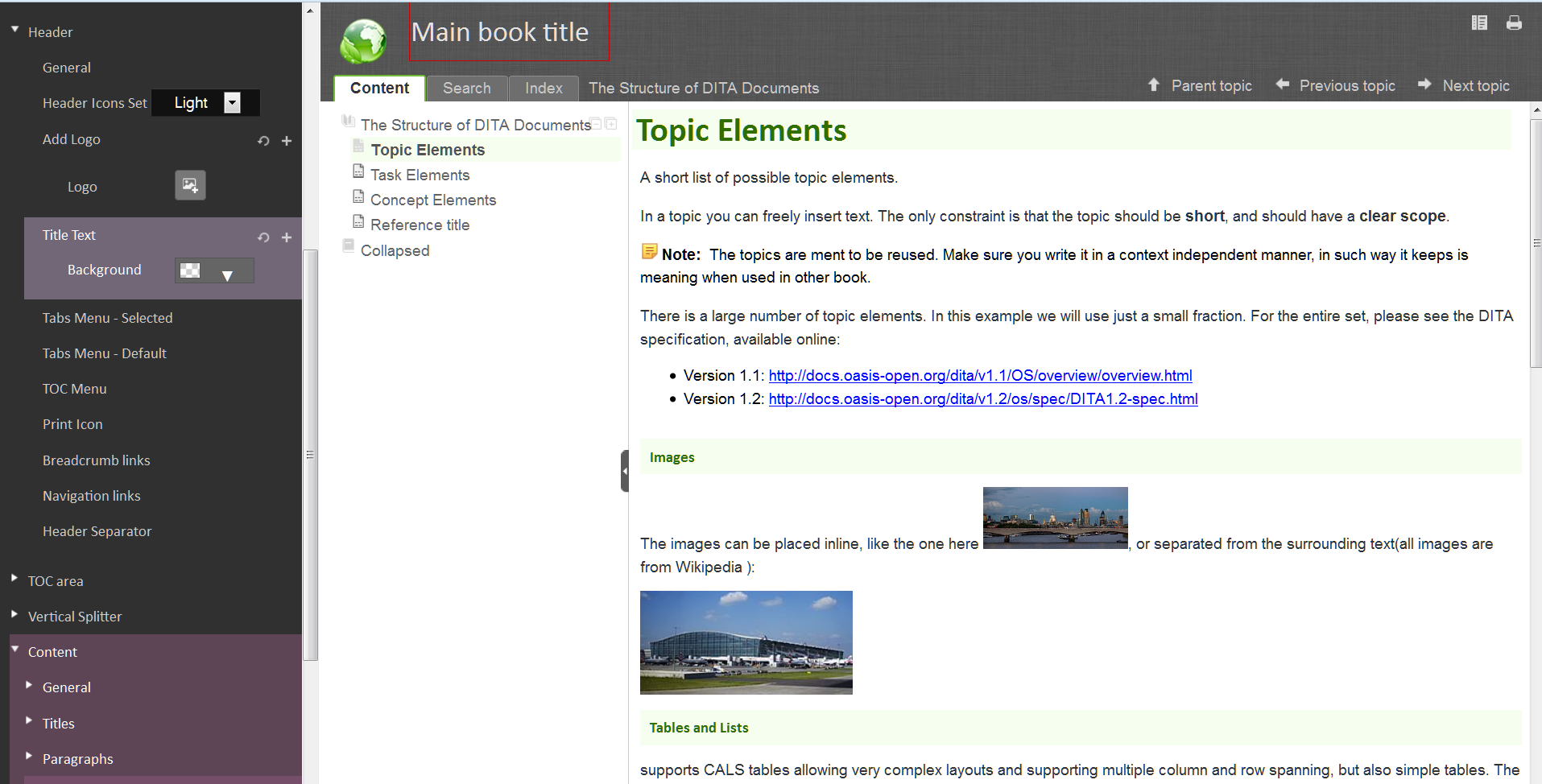 One of the new features of Oxygen 16.0 is the option of setting a skin for the WebHelp pages created by the DITA WebHelp transformation or the DocBook WebHelp transformation, in the form of a CSS stylesheet that modifies the default look of all WebHelp pages in a consistent way.