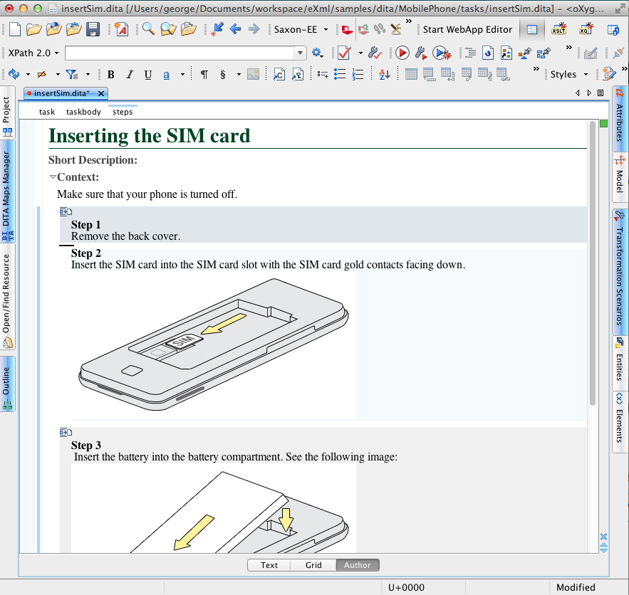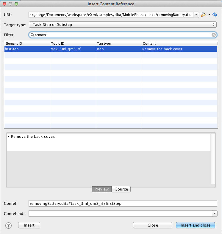 Here it is an example of adding a content reference to a topic. Let's say we have this topic talking about inserting the SIM card in a phone. For that we need to remove the battery, insert the SIM and then add the battery. If we already have a task for removing the battery then we can reuse those steps instead of duplicating them. At the beginning of the steps element we need to add a content reference to refer to the steps from the task that describes how to remove the battery.