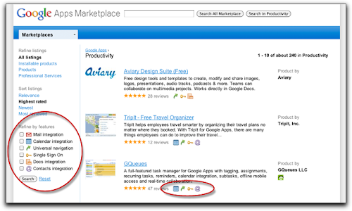 Secondly, more integration directly helps your app’s listing in the Marketplace. Each listing has a set of icons representing product integrations. GQueues integrates with Calendar, Mail, Contacts and Google Talk, which indicates to a customer that using this tool will allow their users to work more efficiently. Plus, customers can search based on integration points, so the more you have, the broader your presence in the Marketplace.
