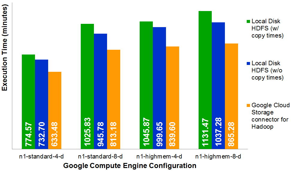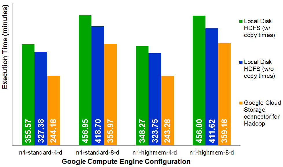 The opportunity for speed-up using the connector is dependent on the amount of reads and writes to Google Cloud Storage. Because the workload reads input data only in the first job and writes output data only in the last of the ten cascaded jobs, there is limited opportunity to improve the execution time using the connector. Also the relatively small dataset (5 GB) for the recommendation engine is able to be processed more quickly on the Google Compute Engine instances and results in less data that needs to be moved between Google Cloud Storage and the cluster.