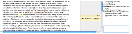 Your professor or TA will receive a link to the doc and a notification telling them that you have shared your doc with them. When they open the doc you will notice that their user name will appear in the top right corner of the screen. You are now collaborating in Google Docs.Your professor or TA can now help you revise your doc in real time. Clicking the blue box in the upper right hand corner of the screen will allow you to chat with them and ask questions as you move through the doc. Your editor can also add comments to your doc without actually rewriting the text. Highlighting a passage and then selecting 'Insert > Comment' will allow them to make a note about that section to the right of the page.