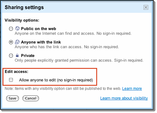 For docs with the sharing settings ‘Anyone with the link’ or ‘Public on the web,’ the Visibility options pane lets you control whether people viewing the doc will also be able to edit it. Check the box next to “Allow anyone to edit (no sign-in required)” if you’d like anyone who opens your doc to be able to edit it.