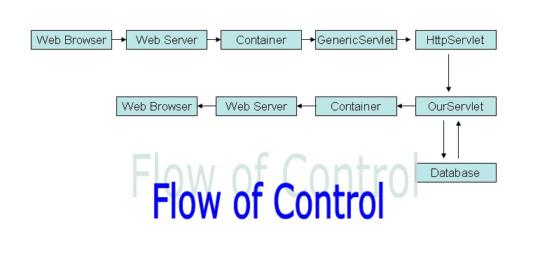 Below is a simple illustration of the flow of control that starts and ends at the Web Browser. Control starts at the browser, goes to the server and then to the container which in turn invokes the Servlet. Our Servlet happily does the processing (which might involve hitting a database) and returns the data to the container which in turn passes it on to the web server which finally displays the contents on the web browser.