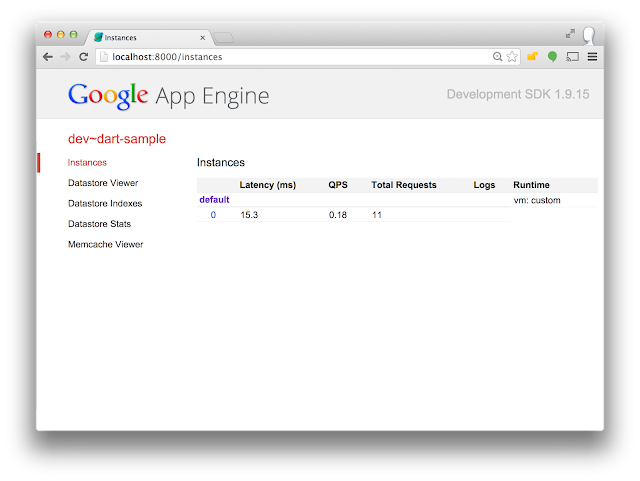 Once you have set up your local development environment, you can quickly write and test your Dart server application using simulated App Engine Services–Datastore, Memcache, Logging, and more–on your development machine. A local admin interface gives you direct access to the services on the running instance. We’ve created several samples to get you started.