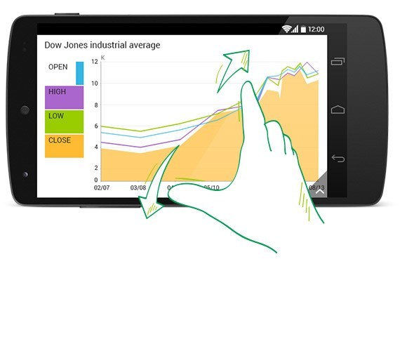 The pinch/pan and drag/zoom gestures deliver smooth and fluid experience when using UI for Android. Thanks to the highly optimized UI virtualization mechanism, the data points are drawn on demand, contributing to highly efficient performance on the mobile device.