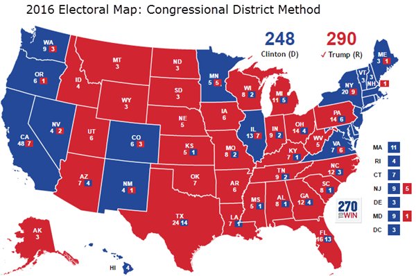 If all states voted like Maine & Nebraska, 2016 looks like Trump 290, Clinton 248. http://ow.ly/thPw307IGZv pic.twitter.com/JHIYnPYEbM