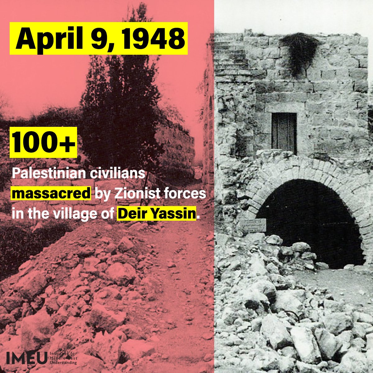 On April 9, 1948, Zionist militias invaded the Palestinian village of Deir Yassin, executed over 100 men, women and children, and then burned their dead bodies.pic.twitter.com/7aIGjOXLvz