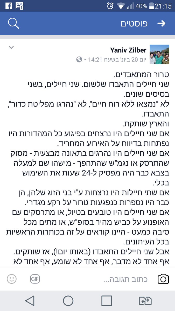 משהו שכתבתי לפני חודשיים וחצי, ורלוונטי לצערי שוב הערב. שני חיילים נוספים התאבדו השבוע. ואף אחד לא מדבר. צועק. נלחם בטרור. טרור המתאבדים.pic.twitter.com/1Al7P9vdp2