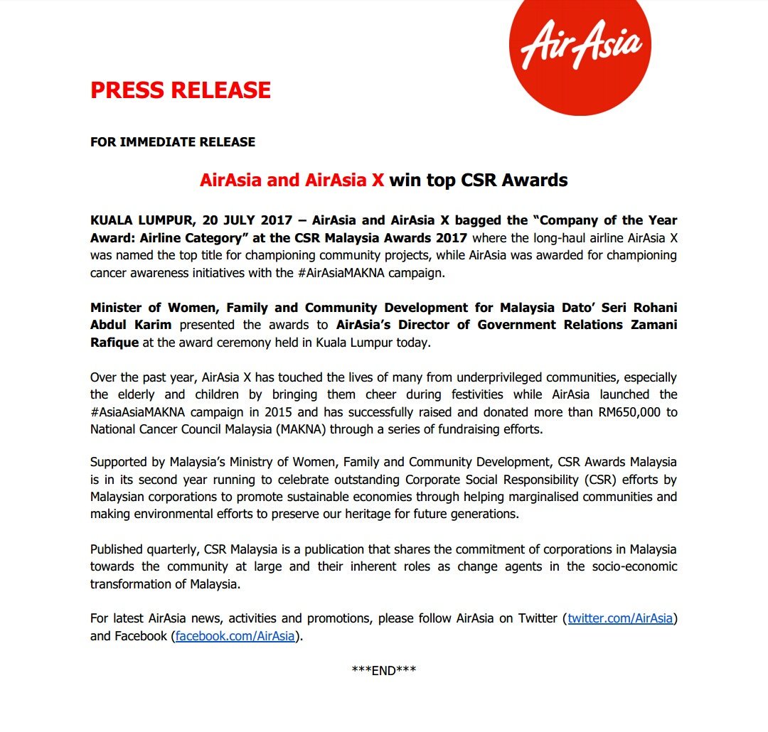 [Press Release] and AirAsia X win top CSR Awards