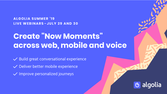 Save the date today to learn how Algolia's new product features create search and discovery "Now Moments" across every platforms. Register now for our live webinars!