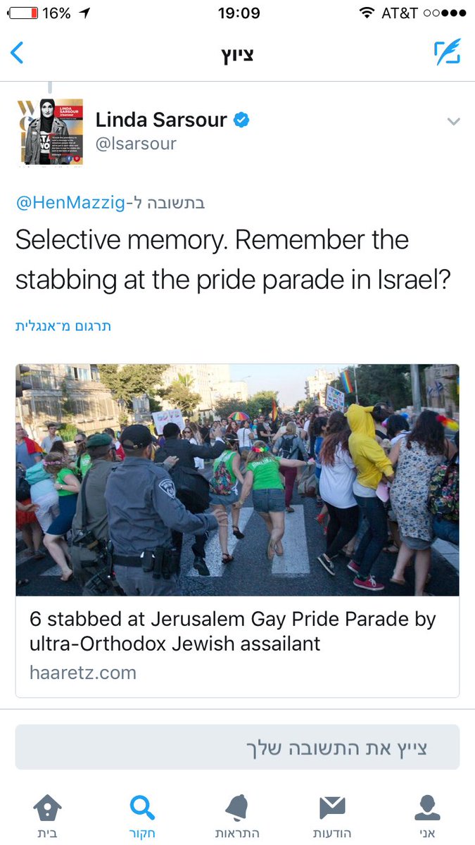 @lsarsour, I do. And I don't remember any stabbings in the Pride Parades in Ramallah and Gaza. Umh, well...I don't remember the paradespic.twitter.com/WI5xf7zwNA