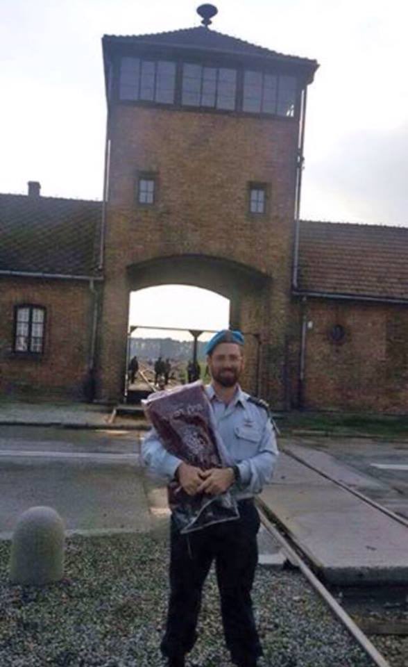 Our revenge against Hitler. Family member in IDF uniform with Torah scroll at Auschwitz last year.