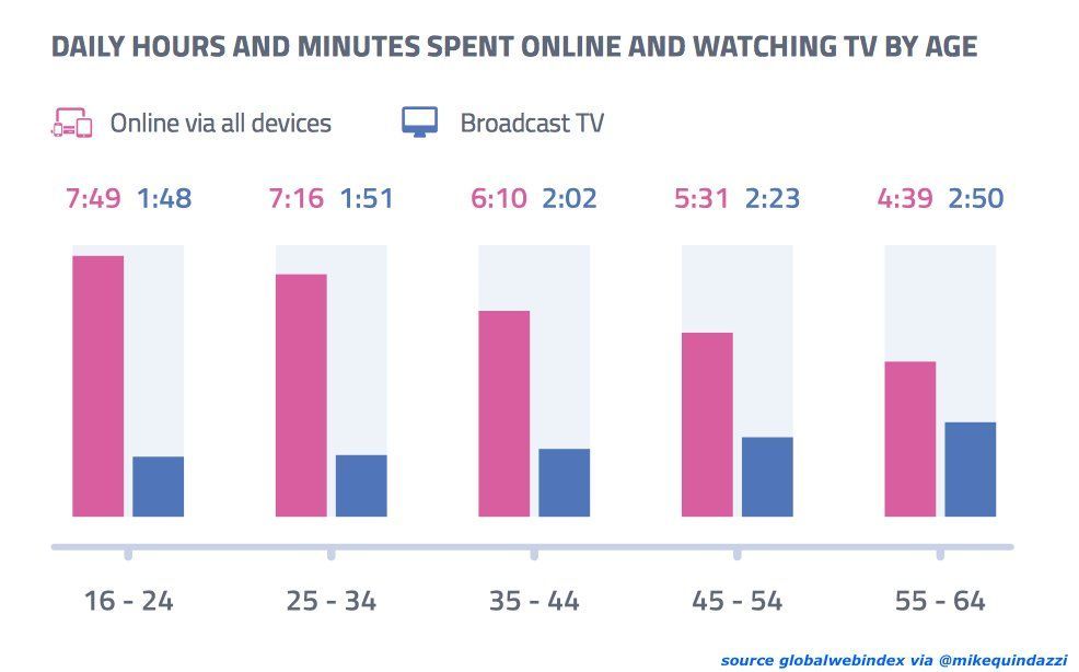 #Online is eating away at#TV time; from#GenZ to#Millennials to#GenX to#Boomers.@globalwebindex@MikeQuindazzipic.twitter.com/VGq4Z5R9yl