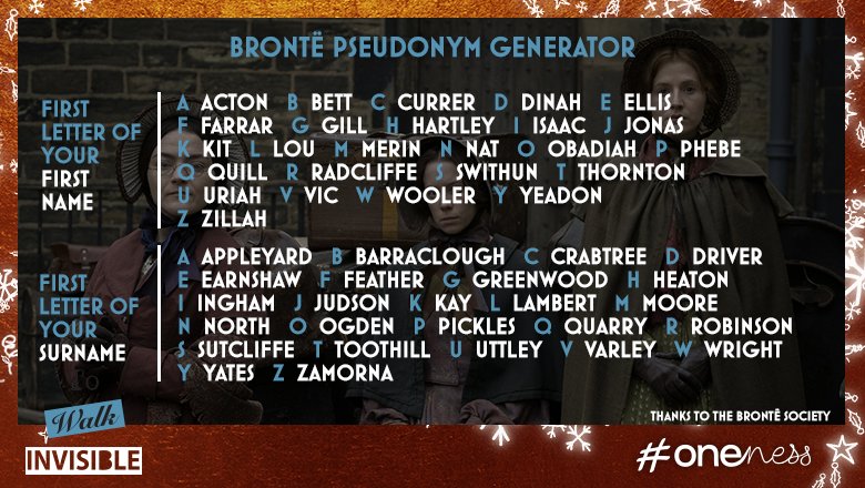 11. Get in the mood for (tonight, 9pm) by creating your own Brontë pseudonym. We’re Bett Baraclough-Crabtree. Who are you? 😀