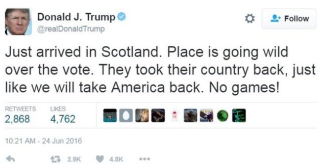 Didn't Trump arrive at Turnberry AFTER the Brexit vote - not before, as he just claimed?http://www.bbc.co.uk/news/uk-scotland-glasgow-west-36606184 …