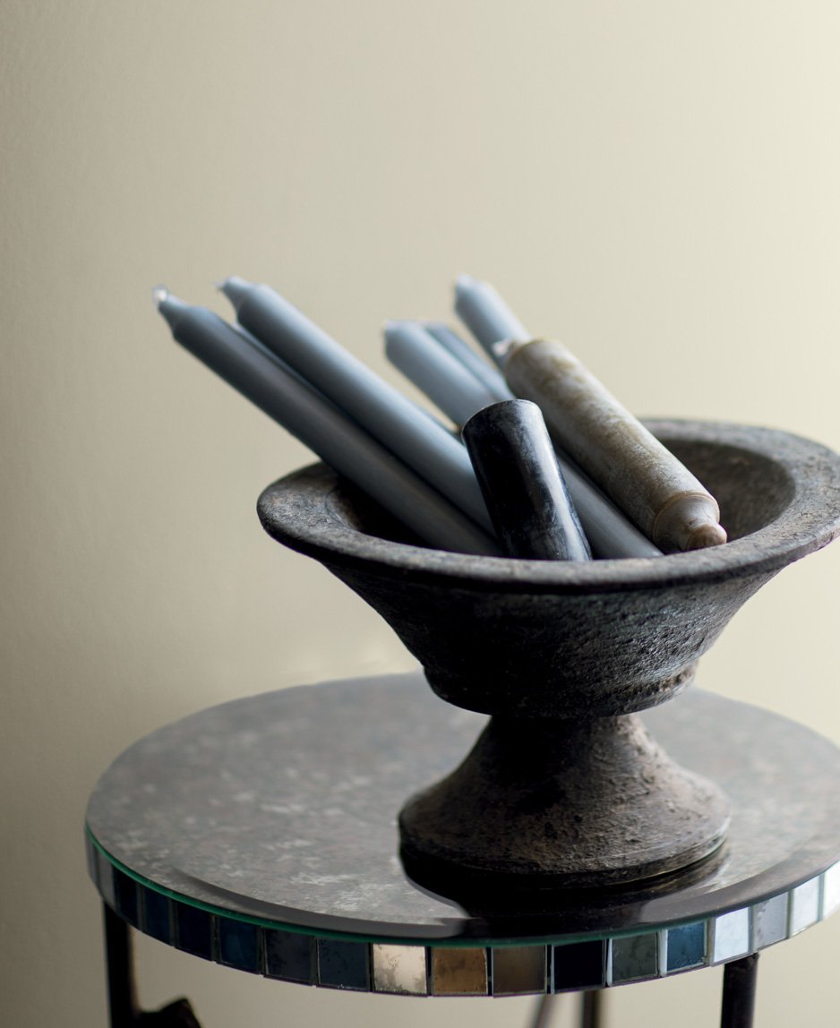 There’s glamour in grisaille—the rich, velvety matte of Balboa Mist OC-27, from the palette, finds timeless beauty in mirrored mercury glass and a collection of candles.