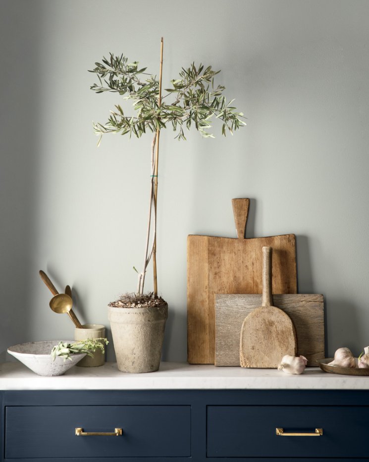 A wall of Metropolitan AF-690 finds the middle ground between striking Hale Navy HC-154 cabinetry and rustic, handcrafted kitchenware.