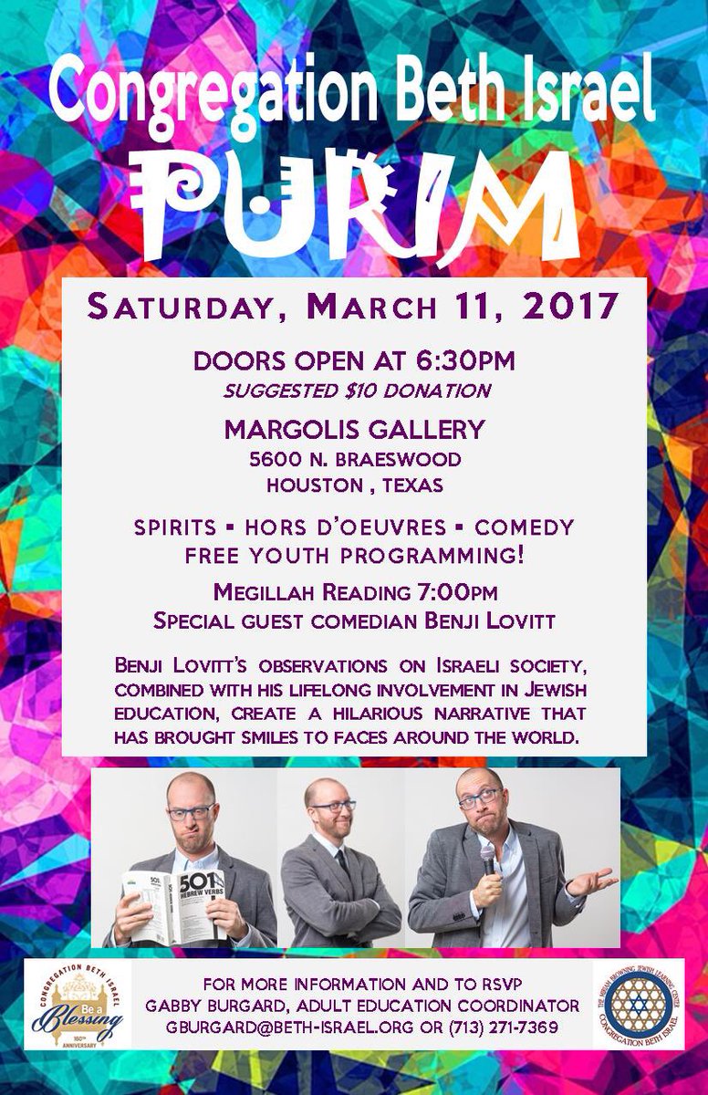 @benjilovitt to Beth Israel for an Adult Purim program! Don't miss it!#Houstonpic.twitter.com/1VUjMDGQEk