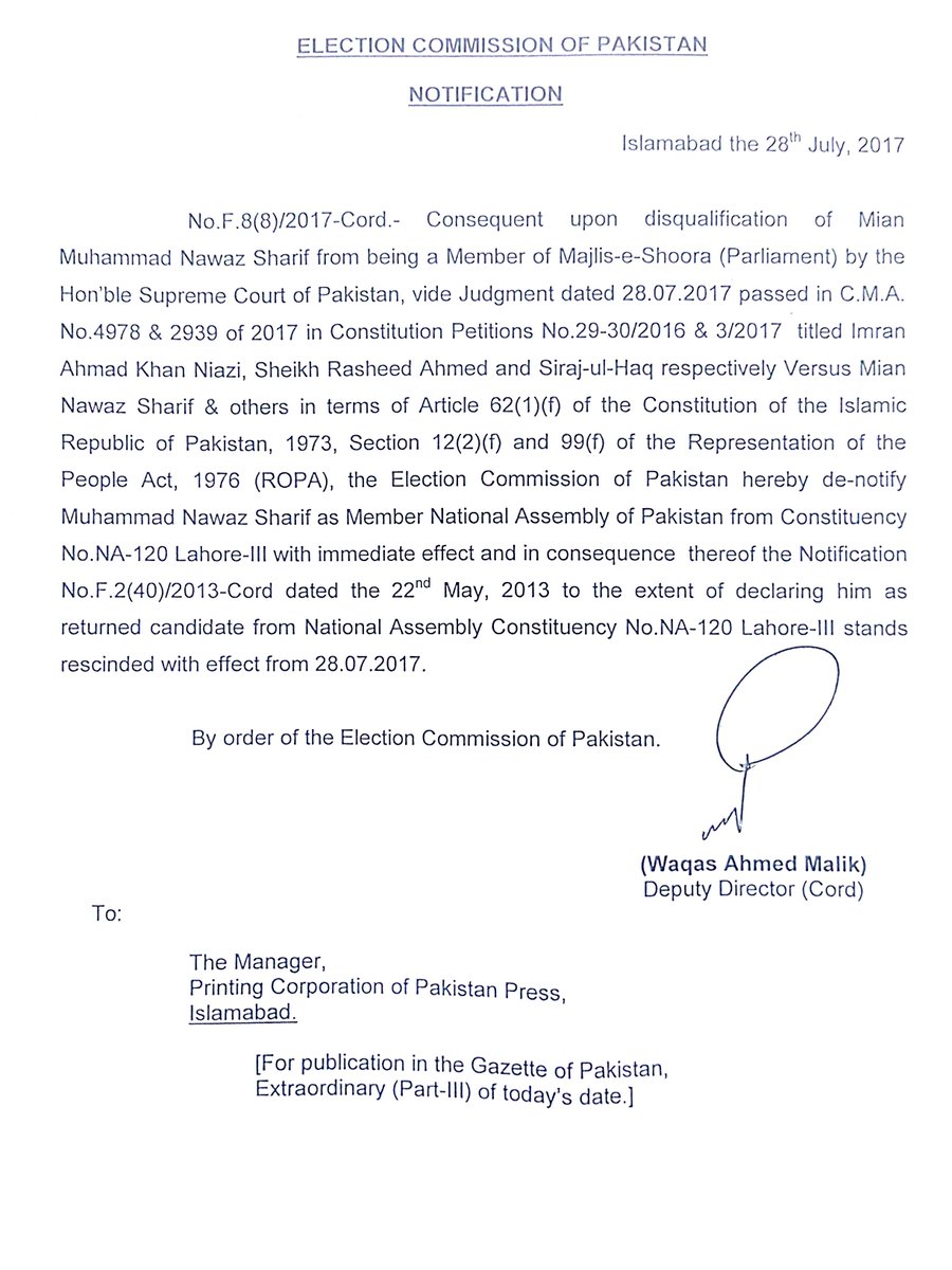 Election commission issued notification of Nawaz Sharif's disqualification.