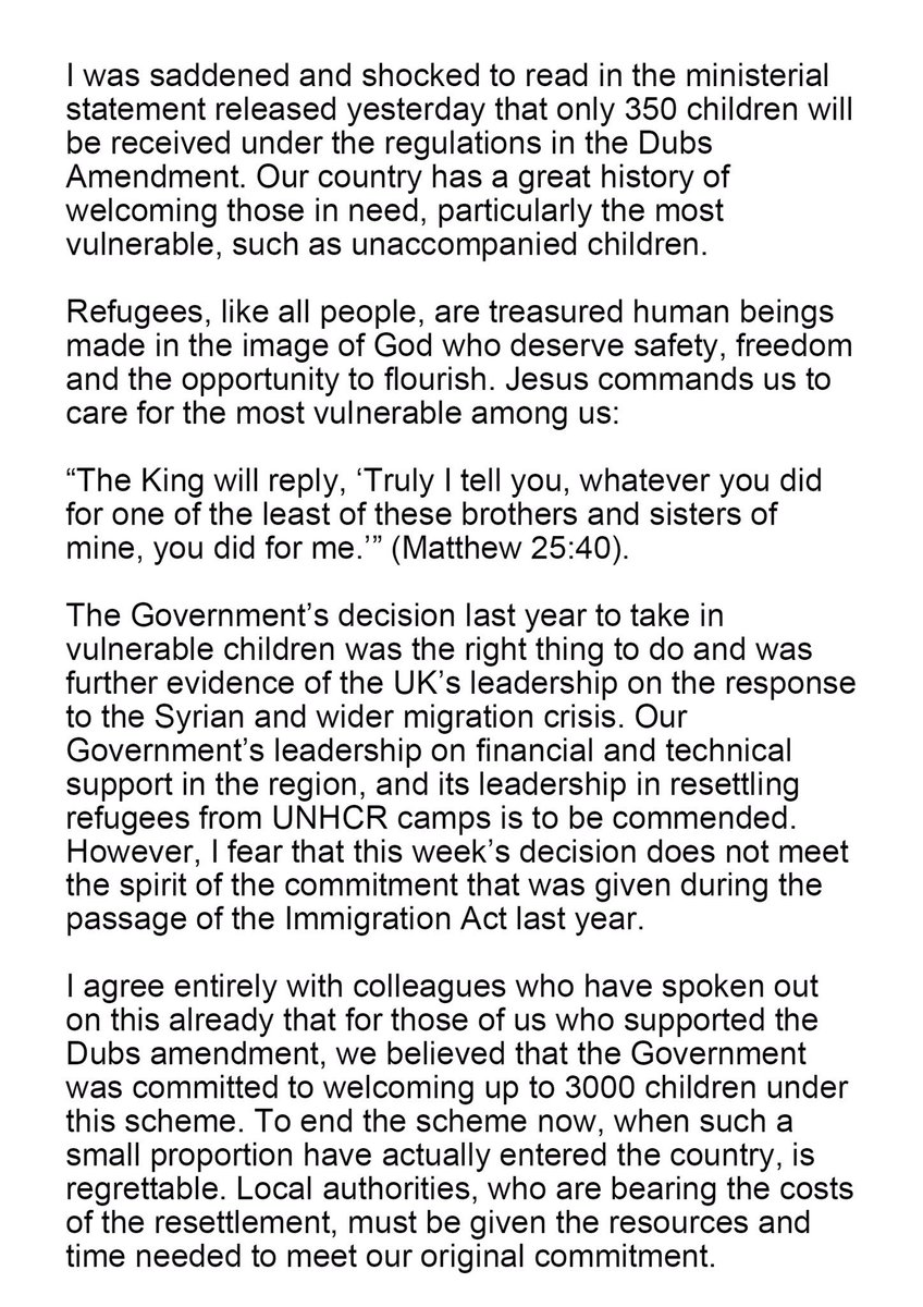 Refugees are made in the image of God. I'm shocked and saddened by the Government's decision on the Dubs Amendment. My full statement: