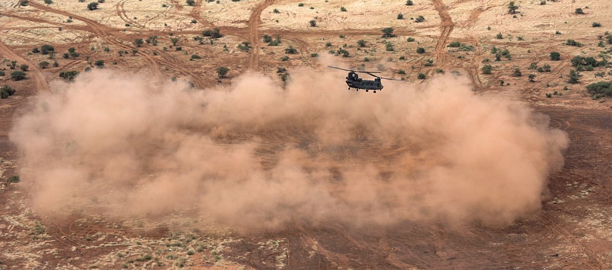 A CH-147F Chinook helicopter lands at a simulated point of injury during a Canadian and Dutch aeromedical evacuation during