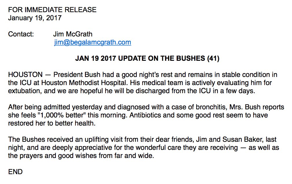 Former Pres GHW Bush in stable condition. Barbara Bush feeling 1000% better, says spokesman statement below.https://twitter.com/jgm41/status/822133130513543172 …