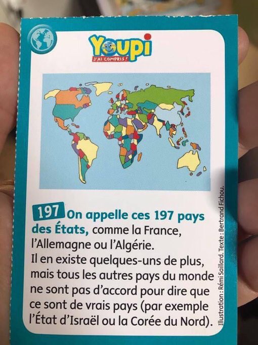 Et c’est faux d’un point de vue pédagogique : la reconnaissance d’un État passe par celle de l’ONU en tant qu’instance. La position d’un seul État n’a pas d’incidence juridique. En droit international Israël est admis comme membre de l’ONU depuis 1949 et les 2 Corée depuis 1991https://twitter.com/sifaoui/status/945231399627513856 …